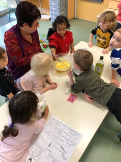 Nous avons préparé deux gâteaux au yaourt pour fêter à l'école les anniversaires de MARGAUX et JANE, nées au mois d'août, ainsi que de DALIA née au mois d'octobre.